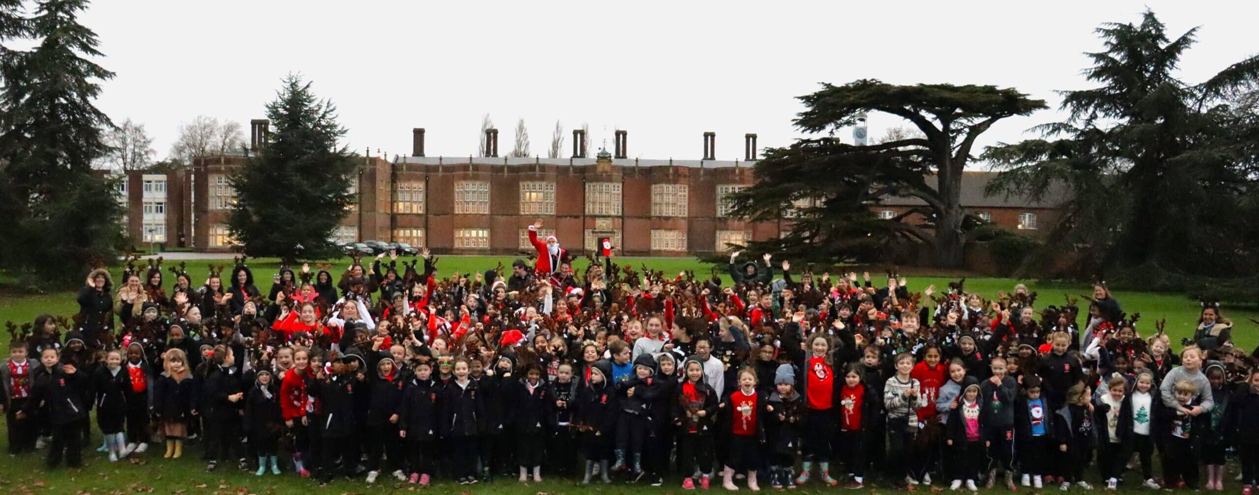 Adorned with antlers and Christmas jumpers, all 380 pupils and staff began their walk from the Prep playground down to The Avenue, our beautiful mile-long and historic entrance to the School, following the Prep Divisions’ own Santa Claus. Older Prep pupils were partnered with the younger Pre-Prep pupils to walk together and enjoy the festive fundraising, while the staff members spread the Christmas cheer by “singing loud for all to hear!”